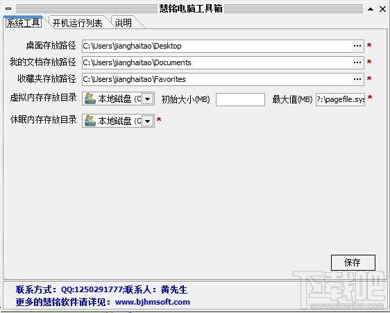 慧铭电脑工具箱可以帮助你进行系统文件路径更改,更改项目包括:桌面、收藏夹、我的文档、虚拟内存、休眠内存等默认路径;其次还可以更改开机启动项。绝对是一款免费免安装绿色软件。