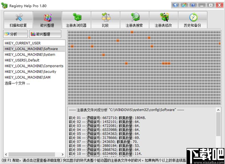 9、您可以在该界面中整理注册表碎片,突出显示的块代表整个驱动器的注册表文件中的碎片。